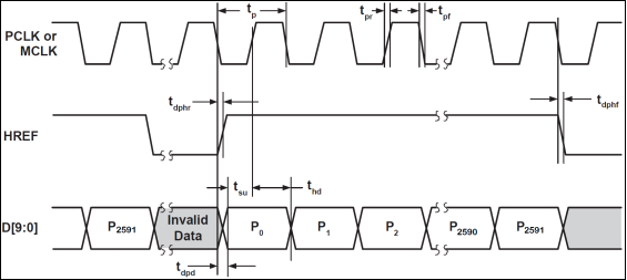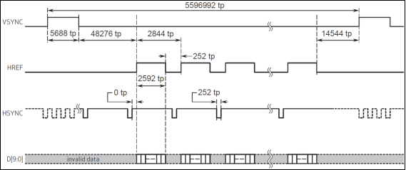 从上图可以看出,图像数据在HREF为高的时候输出,当HREF变高后,每一个PCLK时钟,输出一个8位/10位数据。我们采用8位接口,所以每个PCLK输出1个字节,且在RGB/YUV输出格式下,每个tp=2个Tpclk,如果是Raw格式,则一个tp=1个Tpclk。比如我们采用QSXGA时序,RGB565格式输出,每2个字节组成一个像素的颜色(低字节在前,高字节在后),这样每行输出总共有2592*2个PCLK周期,输出2592*2个字节。