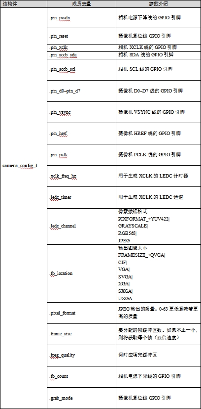返回值描述该函数使用camera_config_t类型的结构体变量传入,该结构体的定义如下所示: