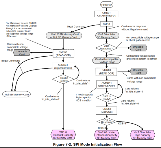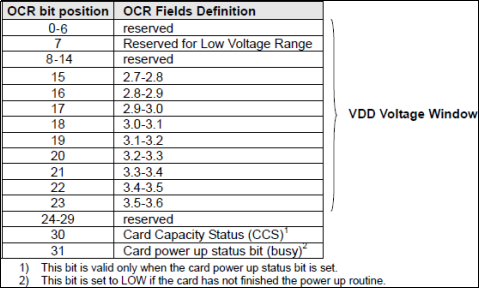SD卡在接收到ACMD41后,返回OCR寄存器内容,如果是2.0的卡,主机可以通过判断OCR的CCS位来判断是SDHC还是SDSC;如果是1.x的卡,则忽略该位。OCR寄存器的最后一个位用于告诉主机SD卡是否上电完成,如果上电完成,该位将会被置1。