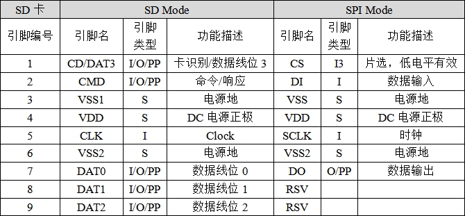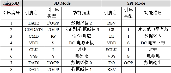 我们对比着来看一下microSD引脚,可见只比SD卡少了一个电源引脚VSS2,其它的引脚功能类似。