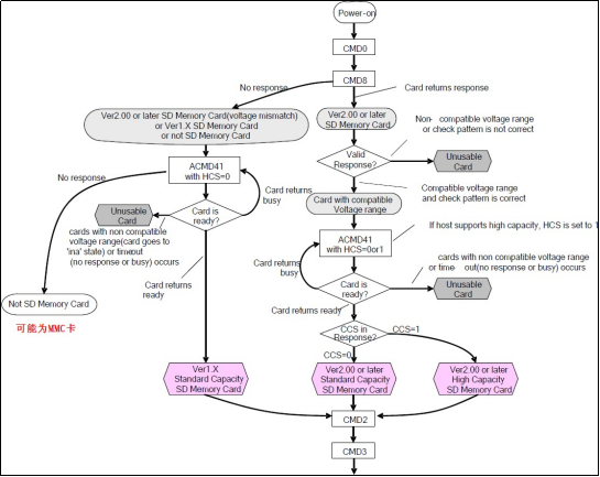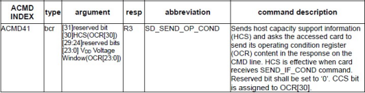 对于支持CMD8指令的卡,主机通过ACMD41的参数设置HCS位为1,来告诉SD卡主机支SDHC卡,如果设置为0,则表示主机不支持SDHC卡,SDHC卡如果接收到HCS为0,则永远不会反回卡就绪状态。对于不支持CMD8的卡,HCS位设置为0即可。