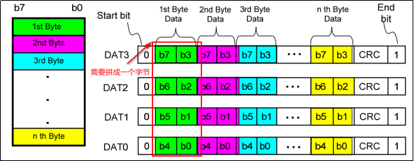 当使用4线模式传输8-bit结构的数据时,数据仍按MSB先发送的原则,DAT[3:0]的高位发送高数据位,低位发送低数据位。硬件支持的情况下,使用4线传输可以提升传输速率。