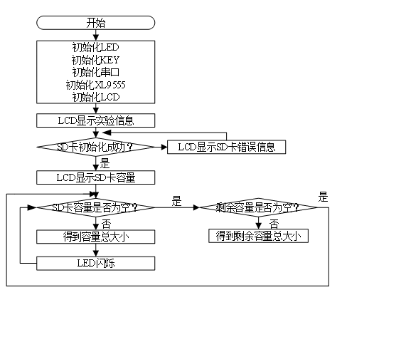 可以看到,本实验的应用代码中,通过初始化SD卡判断与SD卡的连接是否有误,SD卡初始化成功后便通过函数sd_get_fatfs_usage()获取容量等信息,同时也在LCD上显示了SD的容量信息。
