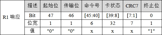 R2~R7的响应,限于篇幅,我们就不介绍了,但需要注意的是除了R2响应是128位外,其它的响应都是48位,请大家参考SD卡2.0协议。