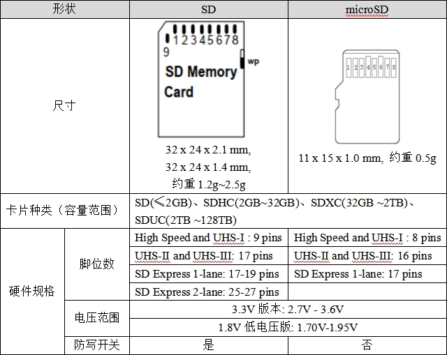 SD卡的规范由SD卡协会明确,可以访问 https://www.sdcard.org 查阅更多标准。SD卡主要有SD、Mini SD和microSD(原名TF卡,2004年正式更名为Micro SD Card,为方便本文用microSD表示)三种类型,Mini SD已经被microSD取代,使用得不多,根据最新的SD卡规格列出的参数如表37.1.1.1所示: