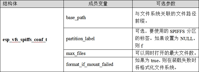 表38.3.2.3 esp_vfs_spiffs_conf_t结构体参数值描述