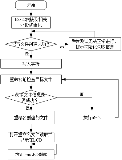 可以看到,本实验的应用代码中,在一系列初始化之后,配置spiffs文件系统各个参数,再建立一个名为/spiffs/hello.txt的只写文件,LED闪烁表明程序正在运行。
