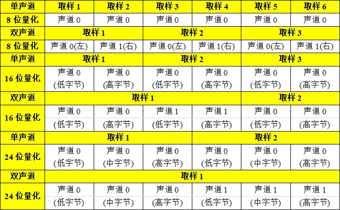 ChunkSize后紧接着就是wav数据。根据Format Chunk中的声道数以及采样bit数,wav数据的bit位置可以分成如表41.1.1.1所示的几种形式: