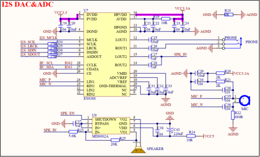 ES8388是上海顺芯推出的一款高性能、低功耗、高性价比的音频编解码器,有2个ADC通道和2个DAC通道,麦克风放大器,耳机放大器,数字音效以及模拟混合和增益功能组成。