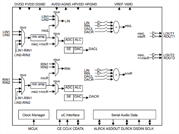 从上图可以看出,ES8388内部有很多的模拟开关,用来选择通道,同时还有一些运放调节器,用来设置增益和音量。