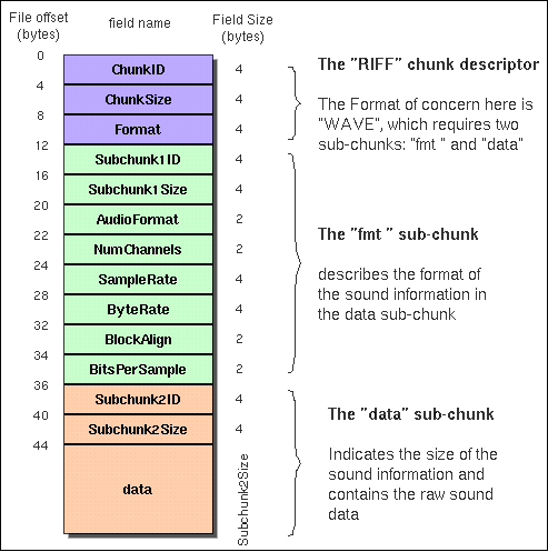 首先,我们来看看RIFF块(RIFF WAVE Chunk),该块以“RIFF”作为标示,紧跟wav文件大小(该大小是wav文件的总大小-8),然后数据段为“WAVE”,表示是wav文件。RIFF块的Chunk结构如下: