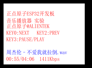 到这里本实验的代码基本就编写完成了,我们准备好音乐文件放到SD卡根目录下的《MUSIC》夹下测试本实验的代码。