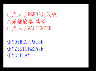 在录音的时候按下KEY0则执行暂停/继续录音的切换,通过LED指示录音暂停。通过按下KEY2,可以停止当前录音,并保存录音文件。在完成一次录音文件保存之后,我们可以通过按KEY3按键,来实现播放这个录音文件(即播放最近一次的录音文件),实现试听。