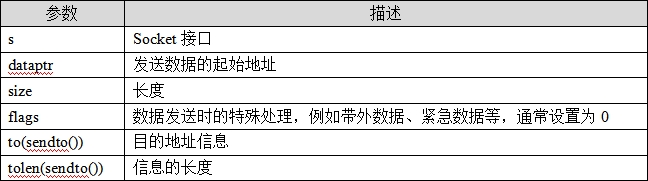 可以看出,函数sendto比函数send多了两个参数,该函数如下表所示: