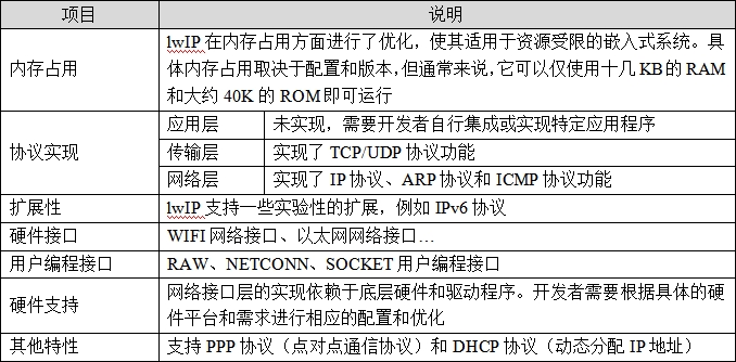 lwIP的各项特性,如下表所示: