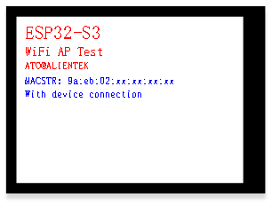 程序下载成功后,我们利用手机连接ESP32-S3热点设备,当手机连接热点设备成功时,LCD显示手机的MAC地址等信息,当手机从已连接状态断开时,LCD显示断开的外部设备的MAC地址。下图为连接成功的LCD显示效果图。