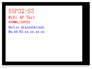 上述源码相对简单,主要将ESP32-S3设备配置为AP模式,即作为热点设备。然后,设置热点设备的账号、密码、安全模式等参数。在WiFi事件回调函数中,当有外部设备请求连接时,程序会在LCD上显示连接设备的MAC地址等信息。而当外部设备从连接状态断开时,LCD会显示当前断开的外部设备MAC地址。