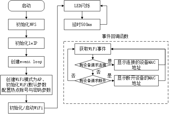 本章实验功能简介:当手机连接这个热点时,LCD显示该连接设备的MAC地址,断开时,LCD显示断开设备的MAC地址。