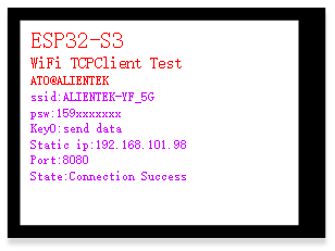 在程序中,首先需要设置好能够连接的网络账号和密码。然后,使用笔记本电脑作为终端,确保它与ESP32-S3设备处于同一网络段内。当ESP32-S3设备成功连接到网络时,它的LCD显示屏上会显示相应的内容: