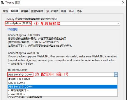 在配置解释器界面下配置解释器和串口端口,如下图所示。