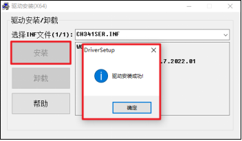 打开CH340C驱动安装程序后,点击安装程序中的“安装”按钮,若提示“驱动安装成功”,则说明CH340C驱动已经安装成功了,如下图所示。