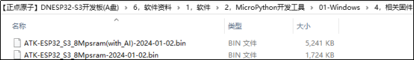 另外,正点原子提供了两个MicroPython出厂固件,它们唯一区别是是否携带AI接口,读者可在资料A盘\6,软件资料\1,软件\2,MicroPython开发工具\01-Windows\4,相关固件路径下找到,如下图所示: