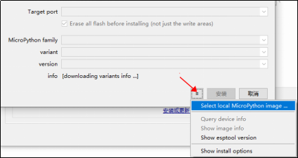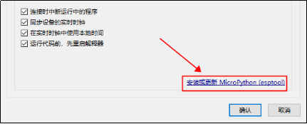 在Thonny工具中,选择“运行”菜单中的“配置解释器”选项,然后点击“安装或者更新microPython(esptool)”如下图5.3.6所示,进入固件烧录界面,如下如5.3.7所示。