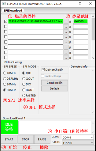 上图①表示选择下载的固件;上图②表示该固件将被下载到ESP32-S3的Flash哪个地址,这里我们选择0x0000;上图③和④表示SPI Flash速率及模式,这里我们选择80MHz和QIO模式;上图⑤表示串口端口和波特率,这里我们选择COM4(不同电脑插入,端口号也不同)和115200;上图⑥表示Flash固件下载开始、停止和擦除按键。