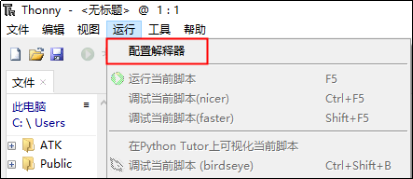打开Thonny工具,点击“运行”->“配置解释器”选项,如下图所示。