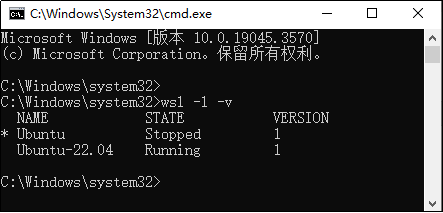1,查询WSL系统状态。使用管理员身份打开CMD命令行,并在命令行输入“wsl -l -v”查看wsl虚拟机的名称和状态,如下图所示。