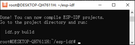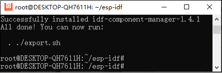 root@DESKTOP-QH7611H:~/esp-idf#目录下输入两条命令“./install.sh”和“source export.sh”,它们分别是安装IDF环境和设置环境变量,设置成功之后系统提示“../export.sh”信息表示安装及设置环境变量成功如下图所示。