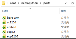 对于微控制器开发者最有用也是最直接操作的目录是ports,里面存在了MicroPython支持的所有微控制器的移植代码,如下图所示。