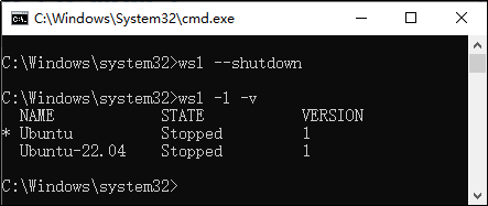 2,停止WSL子系统。输入wsl --shutdown使Ubuntu-22.04停止运行,再次使用wsl -l -v确保其处于stopped状态,如下图所示。