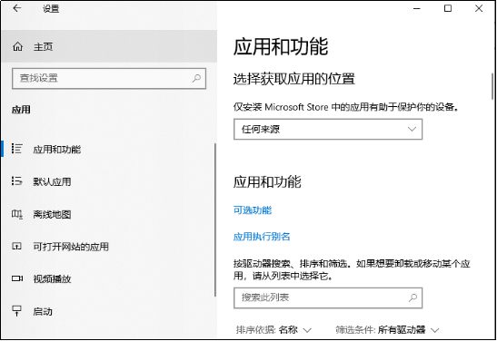 在上图中,点击“应用”选项,进入应用和功能界面,如下图所示。