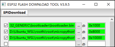 根据上图所示,系统在esp32\build-ESP32_GENERIC文件夹下生成了三个bin文件,它们分别为bootloader.bin、partition-table.bin和micropython.bin。然后,我们使用flash_download_tool_3.9.5.exe工具将这三个bin文件烧录到ESP32芯片中,设置方法如下所示: