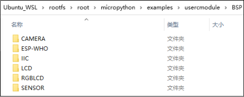 在上图中,我们复制CAMERA、ESP-WHO、IIC、LCD、RGBLCD、SENSOR文件夹至D:\Ubuntu_WSL\rootfs\root\micropython\examples\usercmodule\BSP目录下,如下图所示。