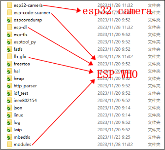 上图的五个文件夹已经放置在A盘→6,软件资料→1,软件→2,MicroPython开发工具→01-Windows→3,摄像头与AI库目录下,开发者可直接解压并拷贝到自己的子系统esp-idf/components目录下。