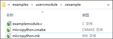 下面,就以cexample C模块为例。首先,打开micropython\examples\usercmodule\cexample目录。该目录包含三个文件,它们共同构成了一个简单的MicroPython C模块。如下图所示。