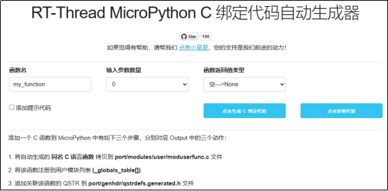 这个辅助工具很简单,只需填写要实现的函数名、传入的参数和函数的返回值类型,即可生成一个MicroPython函数模板。当然,核心代码需要开发者自行编写。