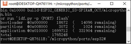 然后在此目录下输入“make USER_C_MODULES=~/micropython/examples/usercmodule/micropython.cmake BOARD=ESP32_GENERIC_S3 BOARD_VARIANT=SPIRAM_OCT”命令编译固件。编译成功后如下图所示。