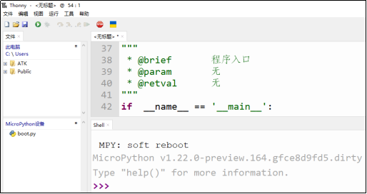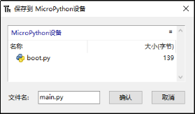 接着,按下“Ctrl+S”保存至MicroPython设备当中,并命名为main.py文件,如下图所示。