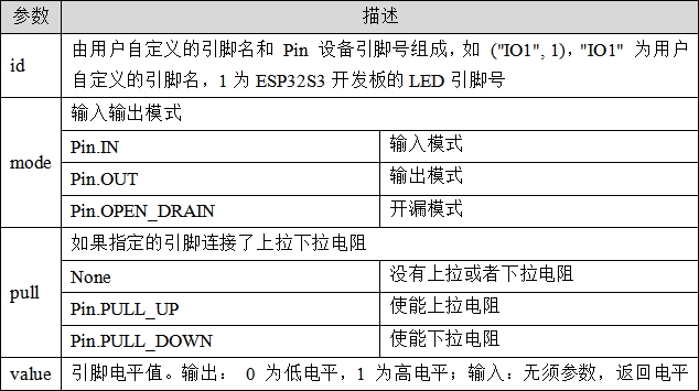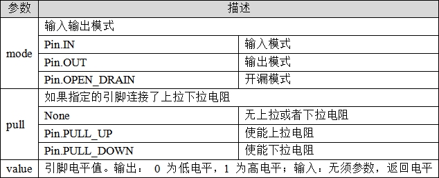 class machine.Pin(id, mode=-1, pull=-1,value=None) 使用示例:led = machine.Pin(1,Pin.OUT,value = 1)