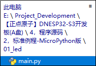 第一种方法很简单,只需把Thonny本地目录设置为正点原子例程目录,然后右键把01_led实验的main.py脚本上存到MicroPython设备当中,如下图所示。