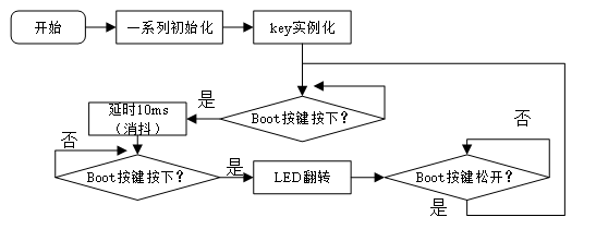 本章实验功能简介:通过开发板上的boot独立按键控制LED灯翻转。