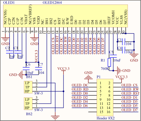 正点原子 OLED模块默认设置是:BS1和BS2接VCC,即使用8080并口方式,如果你想要设置为其他模式,则需要在OLED的背面,用烙铁修改BS1和BS2的设置。模块的原理图如图15.1.2所示: