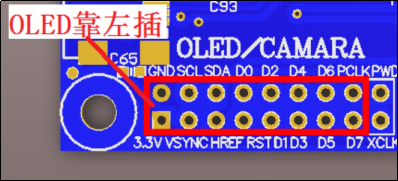 OLED模块的原理图在前面已有详细说明了,这里我们介绍OLED模块与我们开发板的连接,开发板上有一个OLED/CAMERA的接口(P2接口)可以和正点原子OLED模块直接对插(靠左插!),连接如下图所示。