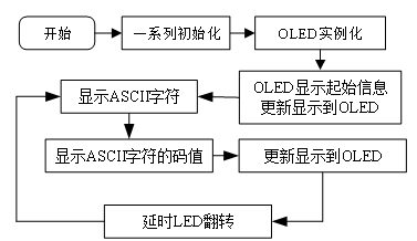 main.py主要功能就是在OLED上显示一些实验信息字符,然后开始从空格键开始不停的循环显示ASCII字符集,并显示该字符的ASCII值。最后LED闪烁提示程序正在运行。