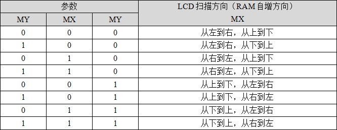 从上图中可以看出,命令0x36可以配置6个参数,但对于配置LCD的扫描方向,仅需关心MY、MX和MV这三个参数,如下表所示。