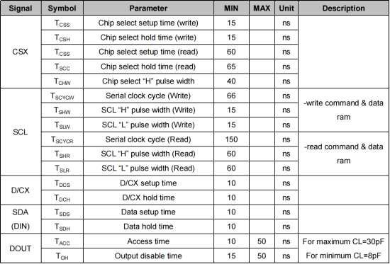 从上图中可以看出,ATK-MD0130和ATK-MD0240模块四线SPI的写周期是非常快的(T SCYCW = 66ns),而读周期就相对慢了很多(T SCYCR = 150ns)。