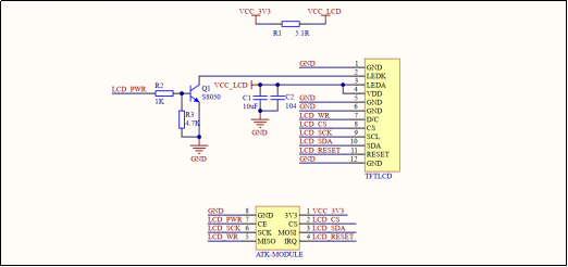 PWR引脚用于控制显示模块的LCD背光,该引脚自带下拉电阻,当PWR引脚被拉低或悬空时,ATK-MD0130模块的LCD背光都处于关闭状态,当PWR引脚被拉高时,显示模块的LCD背光才会点亮。